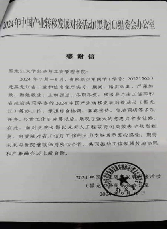 在这个充满挑战与机遇的季节,我院收到了一份来自2024中国产业转移发展对接活动(黑龙江)组委会办公室的沉甸甸的感谢信。