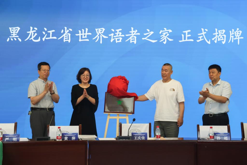 在揭牌仪式上,严明、黄萍、孙超、王庆佳共同为“黑龙江省世界语者之家”揭牌并合影留念。